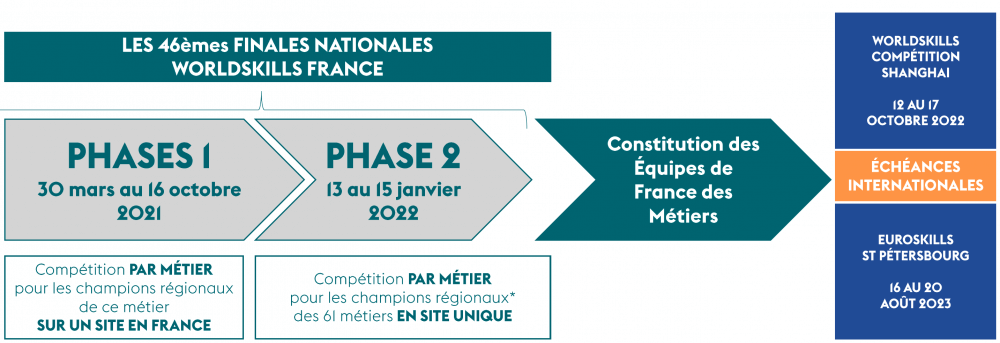 Les Finales Nationales de 46e compétition WorldSkills s’organiseront en deux phases entre le 30 mars et le 16 octobre 2021 et ont pour but d’ancrer les compétitions dans les territoires avec des épreuves pour l’ensemble des équipes régionales organisées par métier et réalisées dans tous types d’établissements de formation, CFA, lycées professionnels, entreprises partenaires, etc. répartis partout en France.